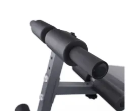 Скамья отличается прочной конструкцией, выдерживающей нагрузку до 100 кг, и оснащена компенсаторами неровности пола для устойчивости. Её ключевым элементом является просторная U-образная подвижная платформа с эргономичной подушкой для коленей и двойными направляющими, высота которой регулируется на 3 уровня, позволяя адаптировать сложность упражнений под разный уровень подготовки.